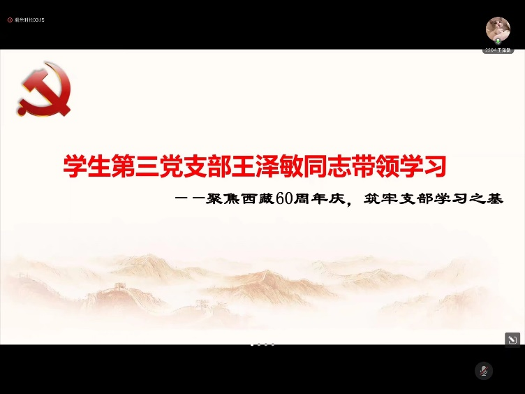 学习体会分享环节,学生党员杨舒琪就“深入贯彻中央八项规定精神”分享了自己的学习心得,她谈到,作为一名党员,贯彻中央八项规定精神,要从自身做起、从细节严起。要主动接受群众监督,把群众的评价作为检验自身作风的“镜子”,不断反思改进,让作风建设的成效体现在为群众服务的每一件小事里;学生党员马罗平就“聚焦西藏60周年庆,筑牢支部学习之基”主题理论学习分享了自己的学习心得,她谈到,作为新时代的青年预备党员,我们要以西藏60年的发展成就为激励,强化支部学习,不断提升自己,在实现中华民族伟大复兴的征程中,书写属于我们的青春华章。