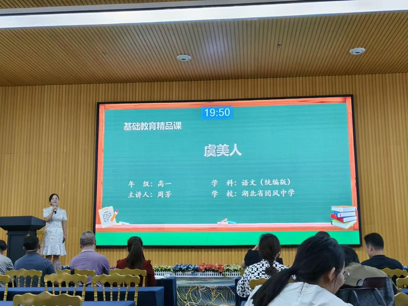 团风中学的周芳老师讲了一位在错位中用血液浇灌出血泪之花的诗人—李煜,讲解他以乐景写哀情,用春水最美的景象衬托出最绝望的愁思。