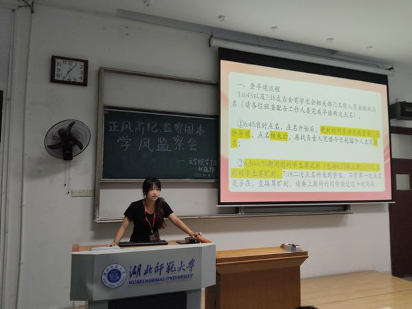 为进一步规范文学院班级日常管理流程,提升监察委员、安全信息委员的履职效能,确保请假、查课、晚点名、查寝等工作依规落地,文学院学生会权益部于10月11日晚上在教育大楼1J23教室组织开展监察与安全信息委专项培训会,常委田华、权益部负责人王晓霏、向鑫、李丹及各班监察委员、安全信息员共同参加会议。