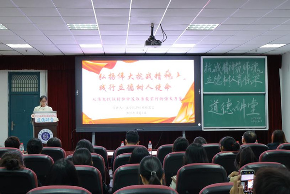 道德宣讲环节,彭江浩老师结合自己三十余年扎根一线教书育人经历,述说着一桩桩、一件件育人故事,传递师者力量,彰显育人温度。她谈到,教师的幸福感来自于耕耘的收获、学生的成长,累并快乐着!她强调,立德树人就是一棵树摇动另一棵树,一朵云推动另一朵云,一个灵魂唤醒另一个灵魂,并激励广大教师要把抗战精神、爱国热情融入血脉、铸入师魂,以创新教学理念重塑课堂,以扎实专业素养启迪智慧,以温暖教育情怀滋润心灵,践行“为党育人、为国育才”的使命与担当。2025级新闻与传播专业研究生张思澳,作为一名海军退役士兵,分享了军旅淬炼中的“酸甜苦辣”,在一场场训练、一次次任务中以实际行动传承发扬抗战精神,努力成为既能扛得起责任,也能拿得出成绩的新时代大学生。