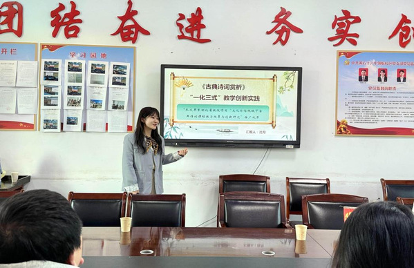 沈月老师结合“新文科建设”的指导精神,系统阐释了古典诗词赏析课程“一化三式”教学模式的内涵,并深入探讨了该模式在“大学-中学”诗词跨学段教学衔接中的实践路径。她还就数智技术在古典诗词教学中的融合应用,分享了前沿思考与具体案例,为中学诗词教学提供了新的思路与方法。讲座结束后,双方教师围绕教学模式应用、师范生培养、实习实训以及招生就业等议题展开了热烈而深入的交流。现场气氛融洽、互动频繁,中学教师及实习教师纷纷表示收获颇丰,对今后教学实践具有积极的启发意义。