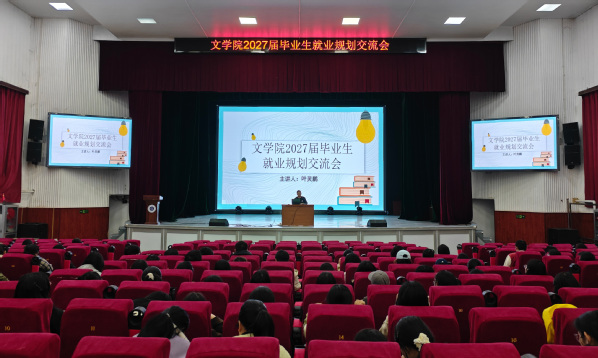 为了更好帮助2027届毕业生正确认识当前考研升学、考公考编、就业等形势,明确就业目标,树立正确就业、择业观,促进学生高质量就业、高水平升学,2026年3月26日晚,文学院在湖师大礼堂举办文学院2027届毕业生就业规划交流会,特邀灵鹏教育叶灵鹏老师作为主讲人。文学院毕业班辅导员吴鸿杰,2023级全体同学到场参与。