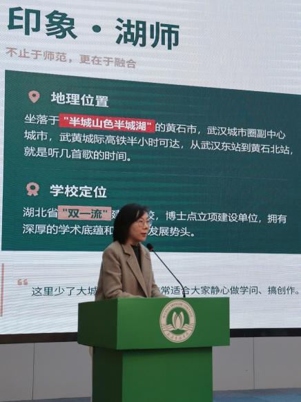 宣讲会上,陈欢老师以“印象·湖师”为开篇,向在场师生全面介绍了湖北师范大学的办学底蕴与发展优势。她指出,学校坐落于“半城山色半城湖”的黄石市,武黄城际高铁半小时直达武汉,既远离都市喧嚣、适宜潜心治学,又深度融入武汉城市圈发展;作为湖北省“双一流”建设高校、博士点立项建设单位,学校自1973年建校以来,始终秉持“诚毅勤敏”校训,为学子搭建了优质的成长平台。陈欢老师也详细介绍了文学院的学科建设与人才培养情况。文学院拥有中国语言文学一级学科硕士点和新闻与传播、国际中文教育、学科教学(语文)3个专业学位硕点,形成了本硕贯通的人才培养体系。